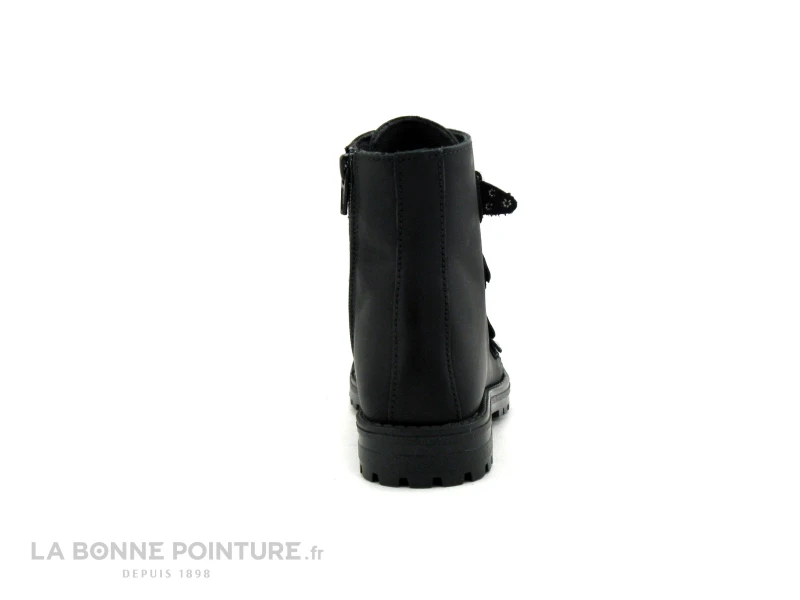 Cette bottine enfant est en cuir lisse noir, avec 4 brides à boucle ornées de petits clous argentés.