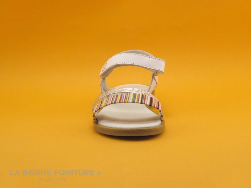 Ce nu-pieds enfant est en cuir blanc, avec des brides à rayures multicolores et argentée sur l’avant.