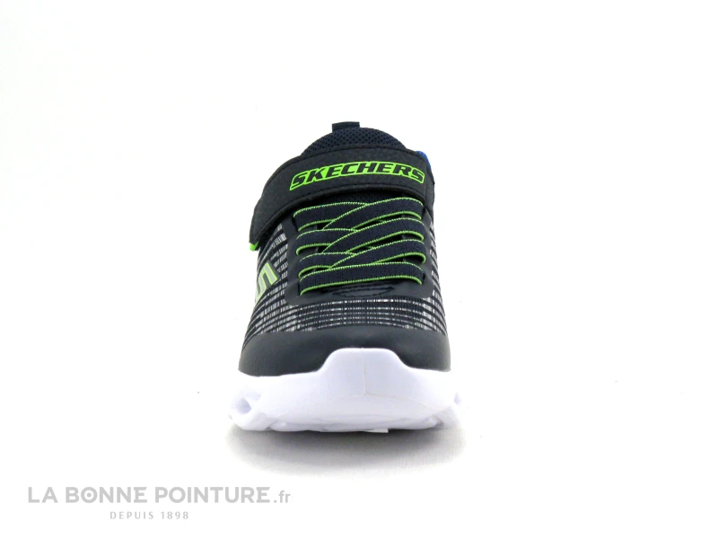Cette basket lumière garçon Skechers Lights® associe textile et matières synthétiques résistantes bleu marine et bleu royal, avec un peu d’argent et de vert.