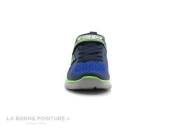 Cette basket mode garçon Skechers Ravlor est en textile et matières synthétiques bleu marine, noir et jaune fluo.