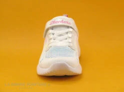 Le lacet élastique bicolore permet d’enfiler et de retirer rapidement la sneaker enfant Skechers Ravlor, qui se ferme avec la bride à scratch.