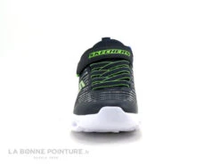 Le logo Skechers rose fushia est apposé sur le contrefort arrière bleu nuit ainsi que sur le velcro qui ferme la cheville.
